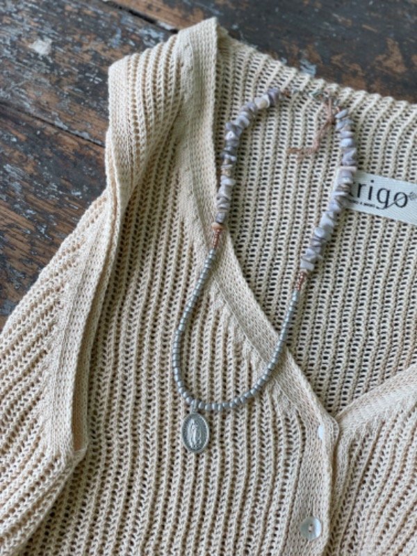 Este modelo tiene un mix de escallas, mostacillas, bolitas de piedra y la medallita de la virgen de Guadalupe.